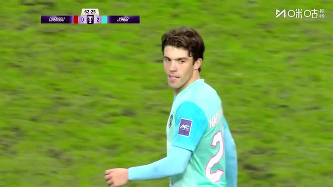 第62分钟,成都蓉城再遭打击,柔佛新山禁区左路送出传中,成都蓉城中路防守漏人,纳乔凌空抽射得手,比分被扩大为0-2。
